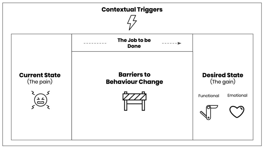 A Jobs to be Done ugyanis az a végső cél, amit valaki el akar érni egy meghatározott kontextusban. Maga a job pedig a folyamata annak, ahogyan eléri ezt a célt, bizonyos körülmények között.