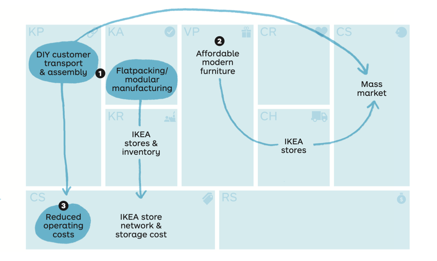 Az is figyelemreméltó üzleti modell újítás volt, amit az IKEA teremtett meg. Náluk arról van szó, hogy az ügyfeleket a kulcspartnerek közé, tulajdonképpen az értéklánc részeivé tették. Ez annyit tesz a gyakorlatban, hogy mivel a bútorok lapra szereltek az tárolási kapacitást spórol meg nekik. A termékeket jellemzően a vásárlók maguk szállítják haza, de a szerelést mindig maguk végzik: ez újabb költség csökkentést eredményezett. Mindez lehetővé teszi, hogy az IKEA az értékajánlatát – bárki számára elérhető modern bútorok – az operációs költségek csökkentésével együtt tudja szállítani.