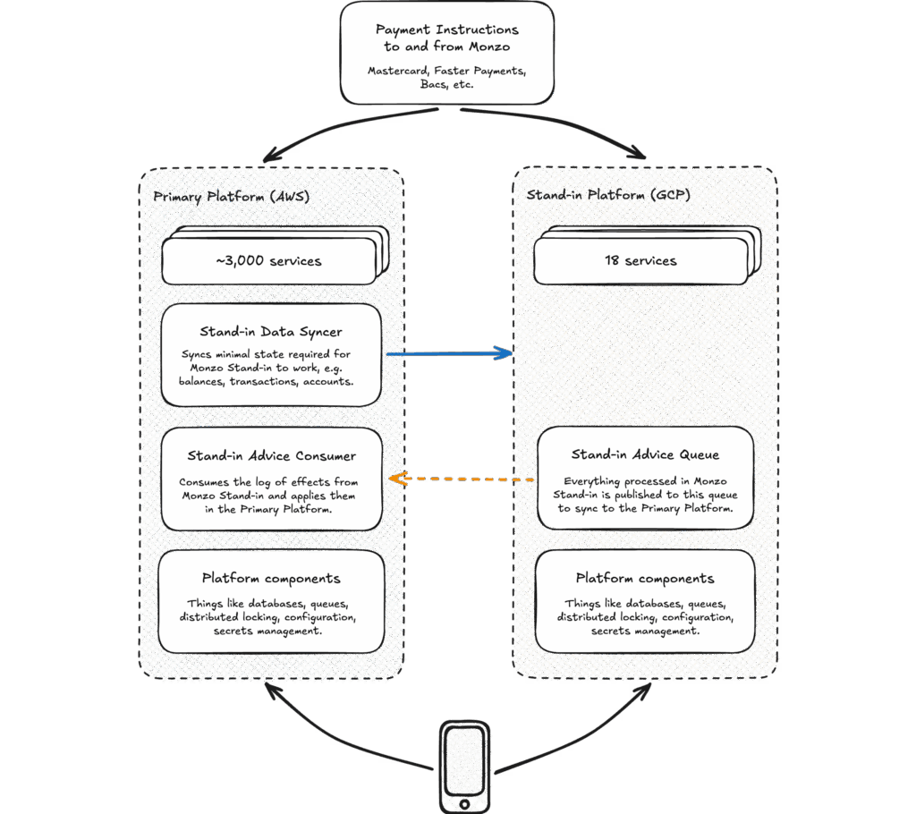A Monzo felismerte, hogy a hagyományos hibatűrési mechanizmusok nem elegendők a ritka, de súlyos hibák kezelésére. Ezért fejlesztették ki a a Monzo Stand-int, ami egy teljesen független, különálló rendszer.