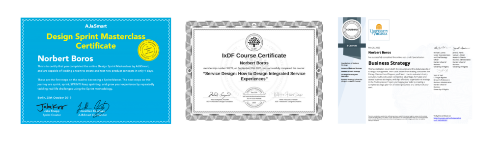 - Workshop evolúció: A workshopok terén szakmai utam a design sprinttekkel való kísérletezéssel kezdődött – amit a mai napig szeretek és szívesen űzök igény szerint – majd a service design révén sajátítottam el a különböző workshopok tervezésének és facilitálásának képességét.