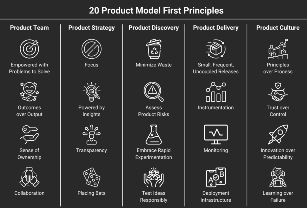 A termék modell koncepciók öt, a sikeres termékek szempontjából kritikus pillér mentén – termékcsapatok, termékstratégia, discovery, delivery, termék kultúra – tartalmaznak összesen húsz elvet.
