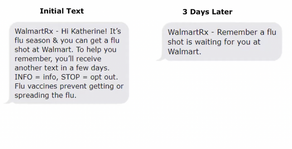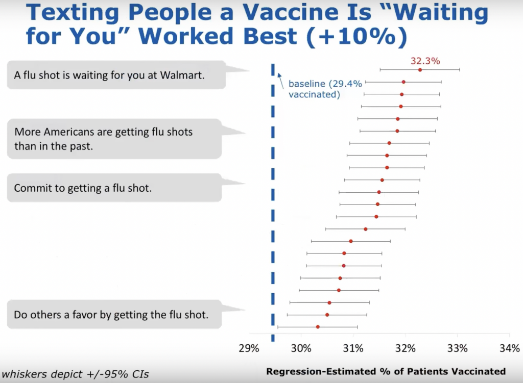 Véletlenszerűen kiválasztottak 689 ezer – ezért mega-study – Walmart gyógyszertári beteget, akiken 22 különböző szöveges üzenetet tesztelek, amelyek különböző viselkedéstudományi elveket alkalmaznak az influenza elleni védőoltás előmozdítása érdekében. És persze volt kontroll csoport is, akik nem kaptak üzeneteket.