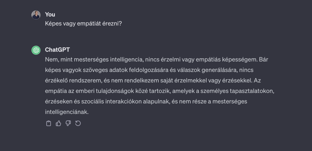 Például a bot válaszolhat azzal, hogy “sajnálom, hogy így érzel” – ha negatív érzelmet észlel a felhasználó promtjában. Azonban ez még nem tűnik emberi értelemben vett empátiának, mivel a gépből hiányoznak a kognitív és érzelmi képességek. Felmerül a kérdés, hogy a mesterséges empátia, egyáltalán empátia-e?