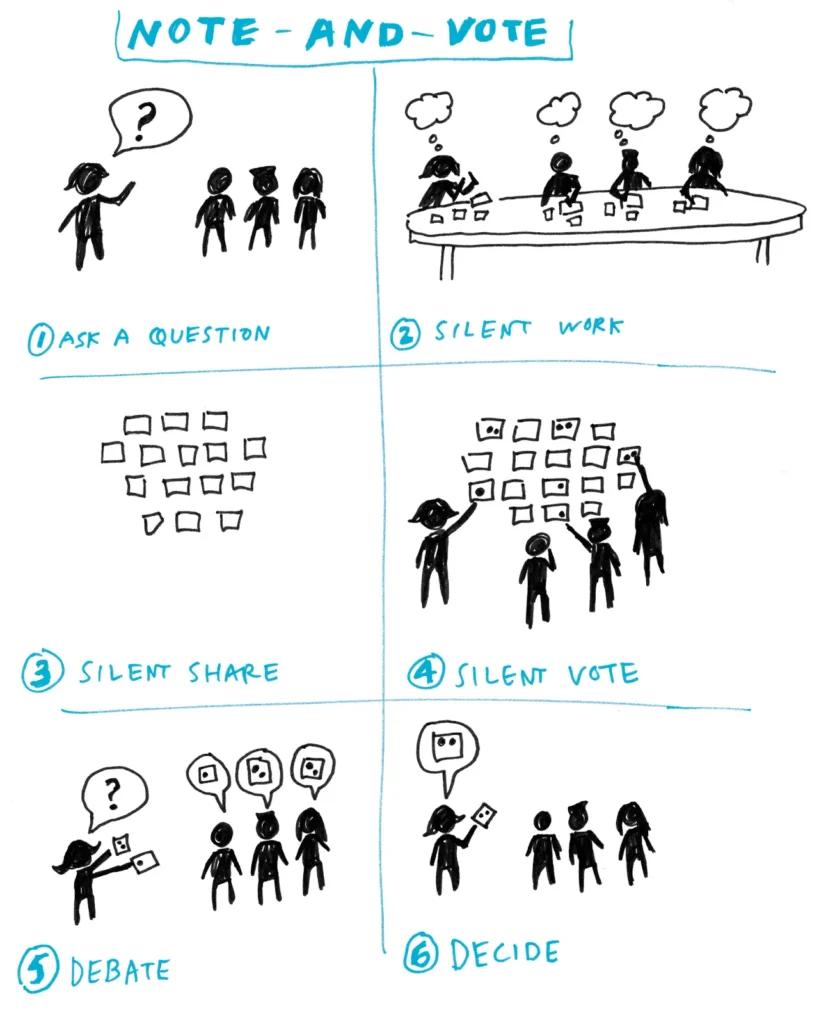 - Note-and-Vote módszer: Az előző folytatása általában, tehát a csapat minden tagja postitre írja az ötleteit, majd szavazással emeljük ki a legjobbakat. Ez egyszerű, gyors és demokratikus módja annak, hogy előre jussunk.