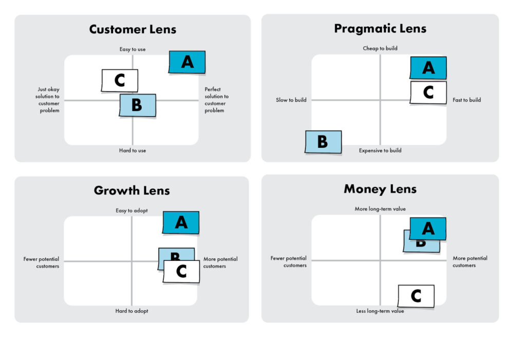 Minden lencséhez felrajzoltok egy nagy flipchart vagy Miro board 2×2-es mátrixot. Ezt követően a megoldási ötleteket közösen elhelyezitek az egyes mátrixokon.