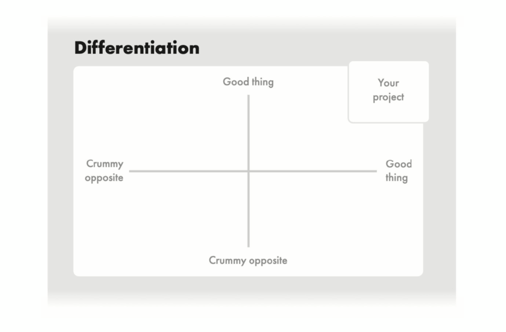 Készítsetek egy 2×2-es mátrixot, amely megmutatja, miben vagytok egyediek az ügyfél szemszögéből. A cél: a versenytársakat „Loserville”-be tolni, magatokat pedig az egyedüli, kívánatos sarokba pozícionálni.