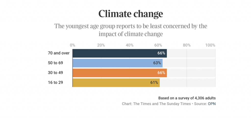Hasonlóan meglepő lehet – de legalábbis ellentétes a mainstream média által terjesztettekkel -, hogy a klímaváltozással kapcsolatosan viszonylag egységesek a generációk. Sőt az Oace for National Statistics 2023-as klímaváltozási kutatása, amely 4000 fő megkérdezésével zajlott azt találta, hogy a fiatalok kevésbé aggódnak a klímaváltozás hatásai miatt mint a szüleik és nagyszüleik: