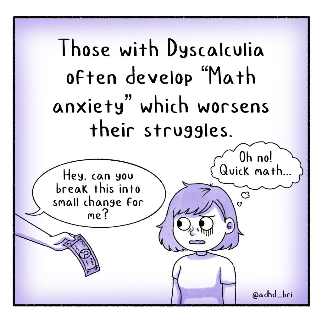 A diszkalkuliás emberek számára problémát jelenthet a számok olvasása, megértése és a számokkal történő munka. Befolyásolhatja a pénzzel kapcsolatos készségeket például, hogy kiszámoljuk mennyi aprót kell adni.