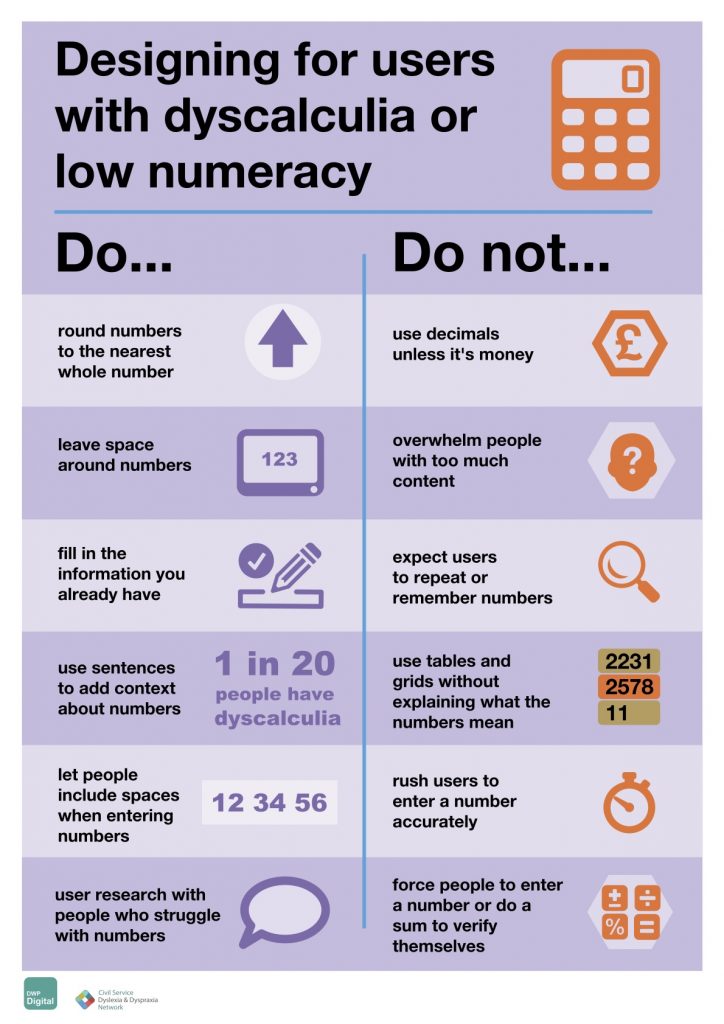 A diszkalkulia nagyon gyakran fordul elő diszlexiával, így azáltal ha a tartalom – beleértve a számokat és a szavakat is – egyszerű és világos, a szolgáltatás sokkal befogadhatóbb lesz.