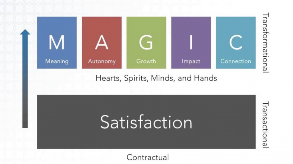 Egy használható kiindulási a modell a “Magic” ami a “Meaning, Autonomy, Growth, Impact, Connection” szavak összeolvadásából keletkezett, és azokat a kulcselemeket jelölik, amik lehetségessé, még jobb esetben optimális teszik az elköteleződést.
