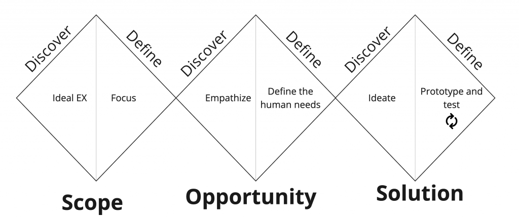 Az említett könyv fogta a design thinking folyamatot és beillesztett az első két gyémánt elő egy harmadikat, egy scoping fázist: