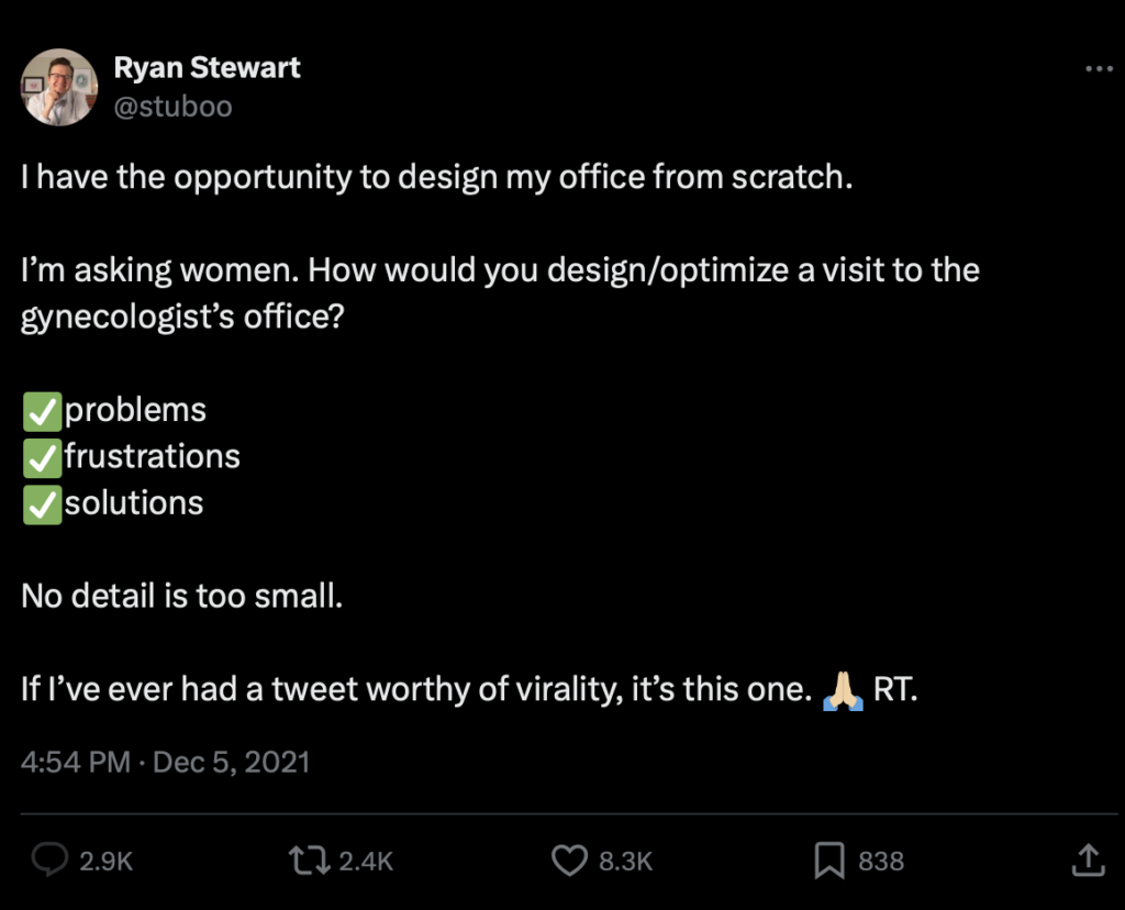 Hasonló a helyzet, ha bizonytalan vagy valamiben, akkor is bevetheted az ügyfeleidet. Egy nőgyógyász orvos például a rendelője tervezett átalakításához kért inputokat: 2900 válasz érkezett.