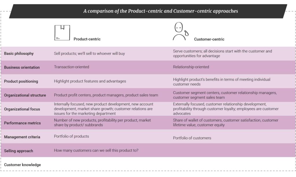 Az ügyfélközpontúság ehhez képest egy alternatív logikát jelent, amely a korábbi domináns logikákkal – mint a termék logika – versengőnek tekinthető. Az ügyfélközpontúság, egy alapjaiban különböző logika, amit az ügyfelek élménye és az a meggyőződés vezérli, hogy a cég által kiszolgált emberek mély megértése az innováció legfontosabb mozgatórugója. Az – ügyfél visszajelzéseken alapuló – iteráció ennek a logikának az egyik legfontosabb eleme.