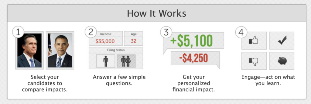 A webalkalmazás úgy működött, hogy meg kellett adnia a választópolgárnak néhány adatot – életkor, lokáció, hány gyereke van etc – és ez alapján a tool kiszámolta a szavazat várható pénzügyi hatását a választó saját helyzetére vetítve.